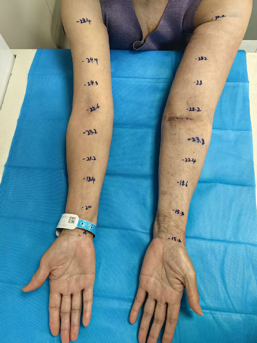 在本次长达近6小时的手术中,医疗团队凭借精湛的显微外科技术与默契协作,成功完成多组淋巴管-静脉吻合。术中可见,原本淤滞在组织间隙的淋巴液,通过新建的“生命通路”顺利汇入静脉系统,手术达到了预期的治疗效果。术后,护理团队为患者提供规范的综合消肿治疗(CDT),与手术形成高效联合,实现手术治疗与护理康复干预1+1>2的显著临床效果。